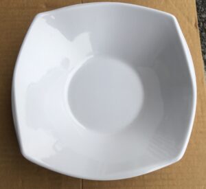 White, square 9 by 9 inches, they are plastic but look like china. Our price set of 5 bowls for $10.00. Quantity available: 15